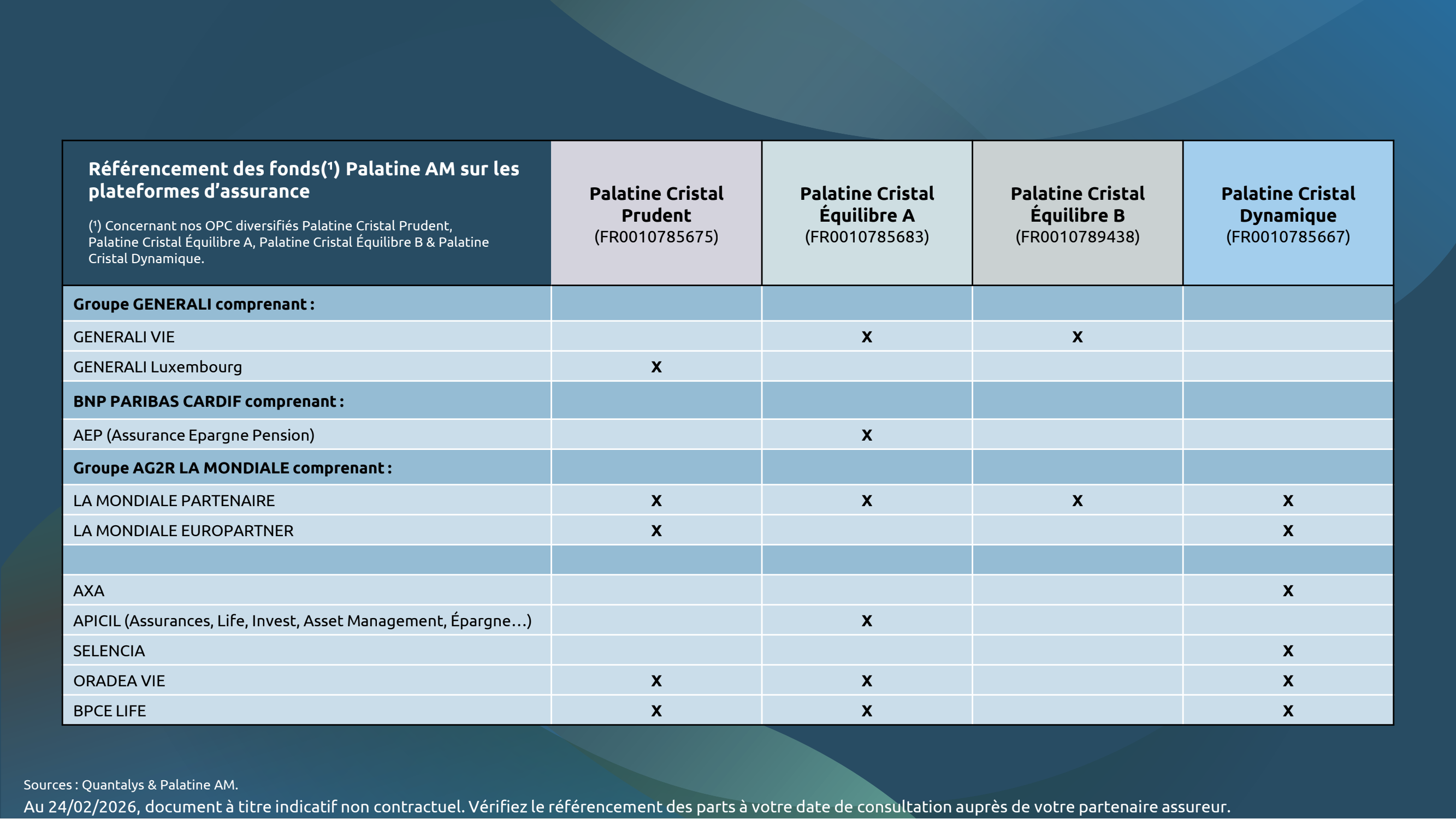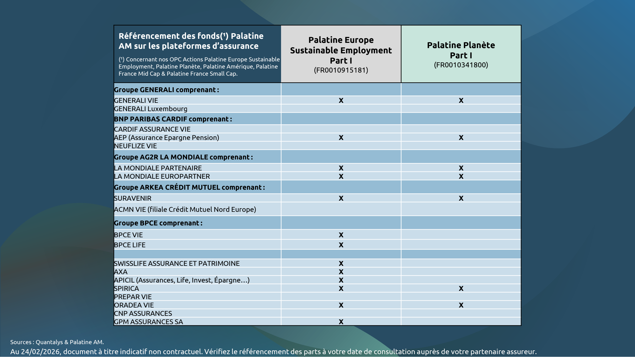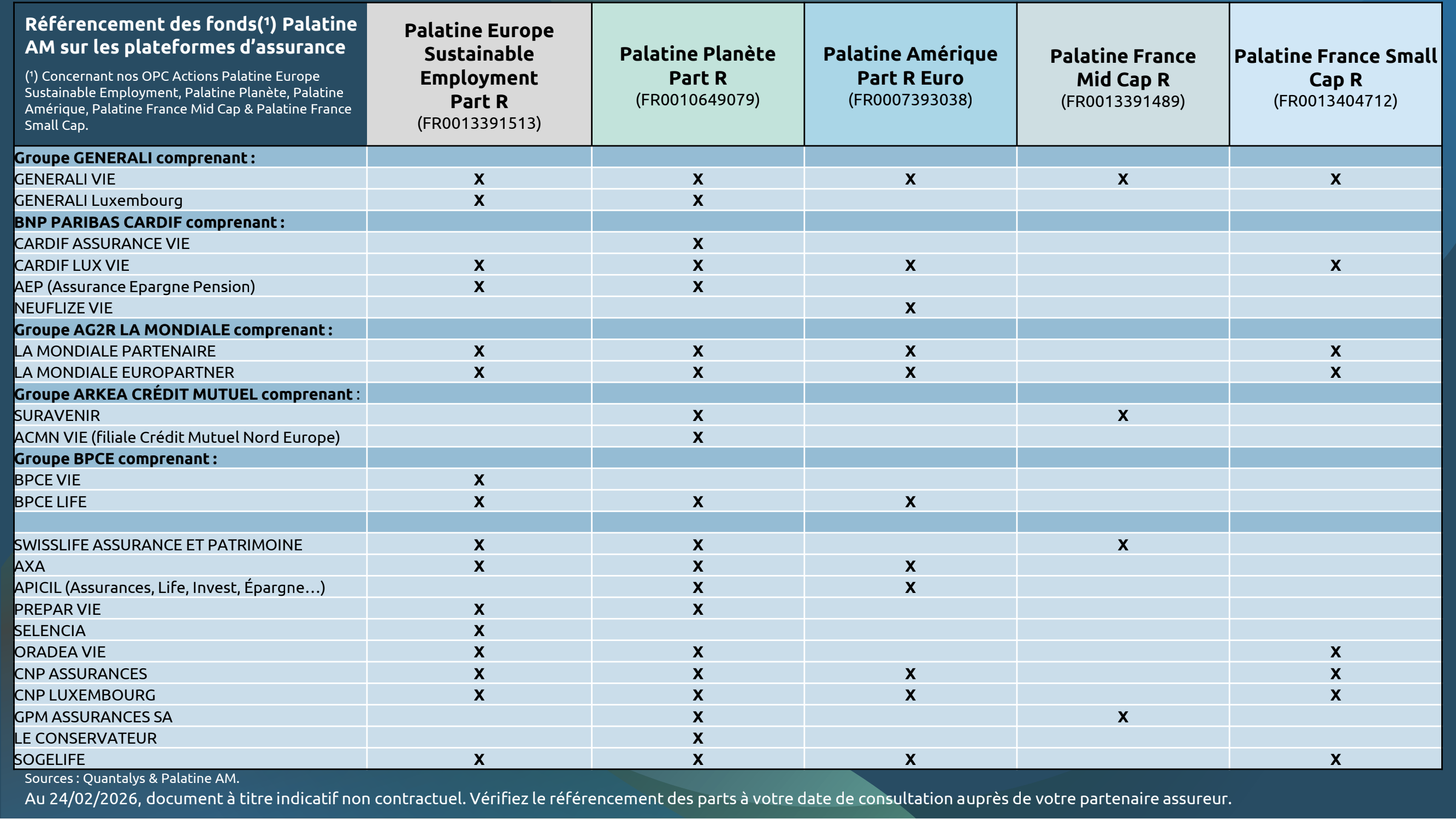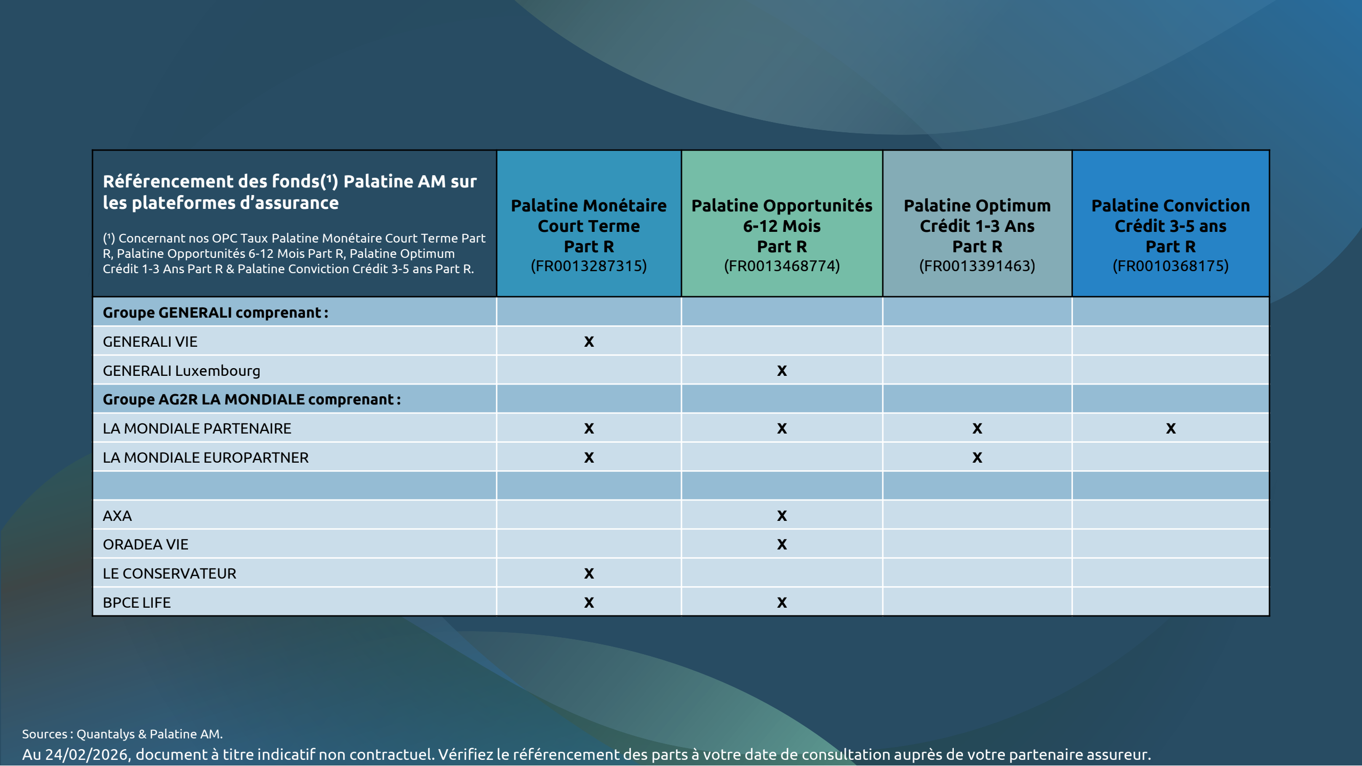 Les fonds gérés par Palatine AM sont référencés et disponibles auprès des principales plateformes d’assurance. Le détail de ces référencements, au 14 novembre 2025, est consultable dans les tableaux indicatifs ci-dessous. Vérifiez le référencement effectif des parts auprès de votre partenaire assureur à votre date de consultation.